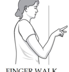 Face a wall three-quarters of an arm's length away. Reach out and touch the wall at waist level with the fingertips of the affected arm. With the elbow slightly bent, slowly walk the fingers up the wall, spider-like, until the arm is raised to the point of comfort. The fingers should be doing the work and not the shoulder muscles. Slowly lower the arm (with the help of the good arm, if necessary) and repeat. Perform this exercise 10 to 20 times a day.
