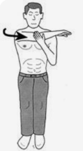 Stand or sit. Using the good arm to raise the injured arm to the elbow, and move it up and over the neck, exerting gentle pressure to stretch the shoulder. Keep for 15 to 20 seconds on the stretch. Perform this 10-20 times a day