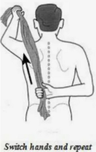 Hold one end of a three-foot-long towel behind the back and grab the opposite end with the other hand. Hold the towel in a horizontal position. Use the good arm to pull the affected arm upward to stretch it. Also, if possible perform an advanced version of this exercise with the towel draped over good shoulder. Hold the bottom of the towel with the affected arm and pull it toward the lower back with the unaffected arm. Perform this 10 to 20 times a day.